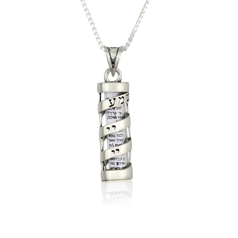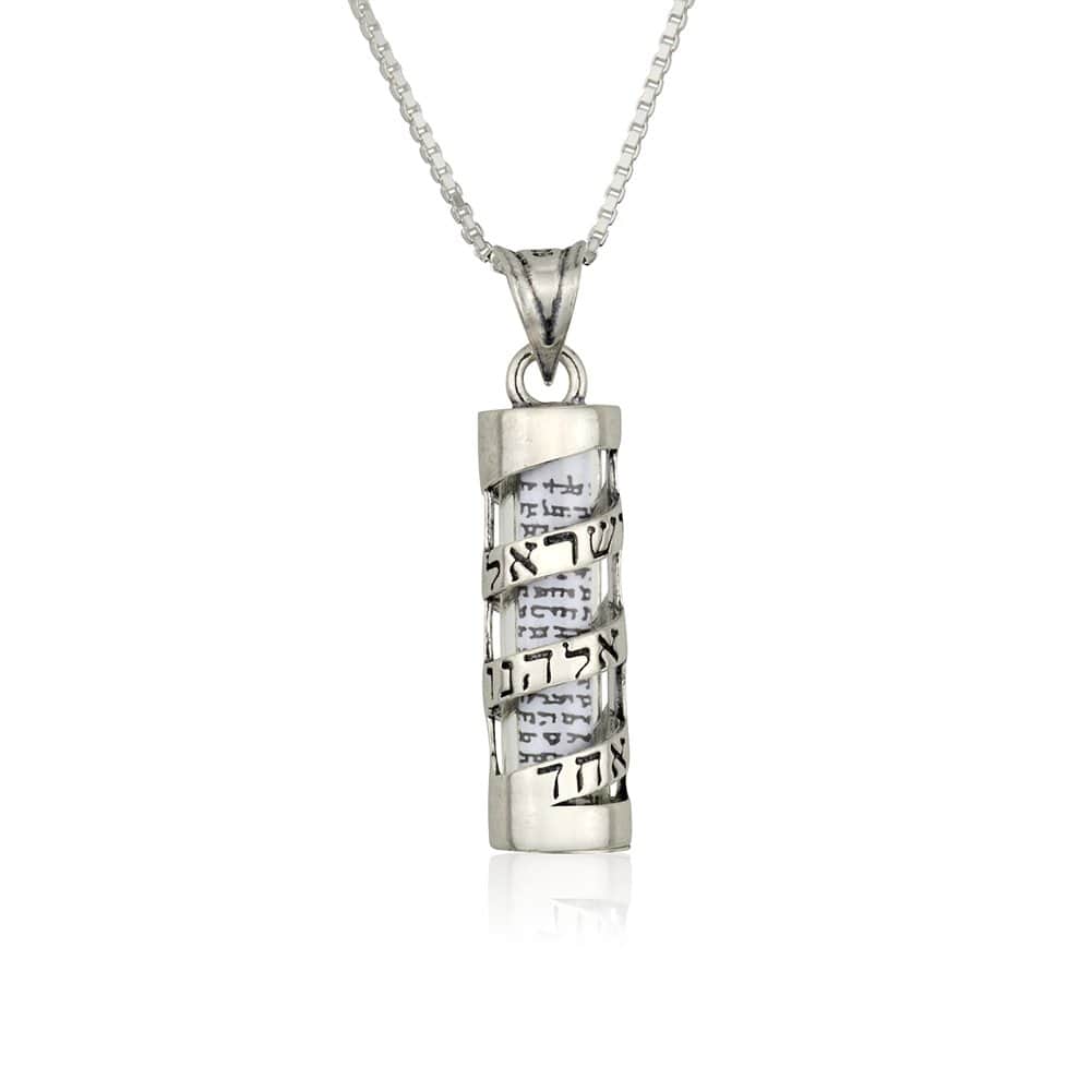 This elegant mezuzah necklace brings Jewish heritage close to your heart. Made in Israel from solid sterling silver, the pendant displays a visible Hebrew scroll with the sacred "Shema Yisrael" prayer – a powerful declaration of faith and unity. Its sleek cylindrical design is framed in polished silver, combining tradition with modern craftsmanship.
