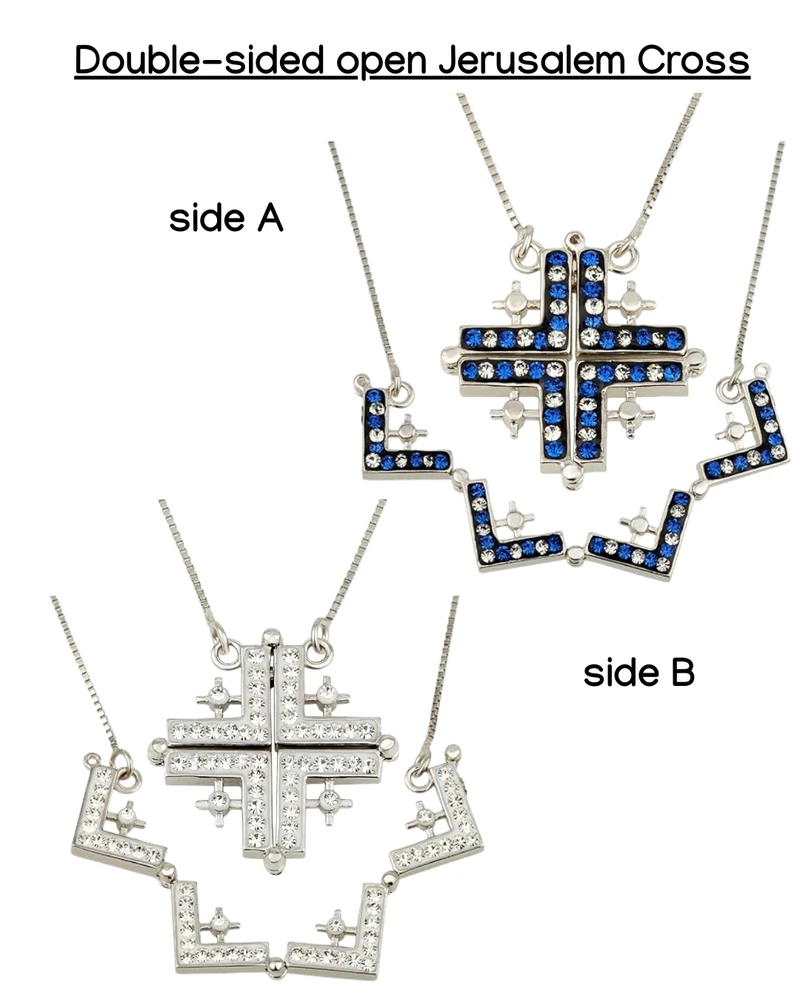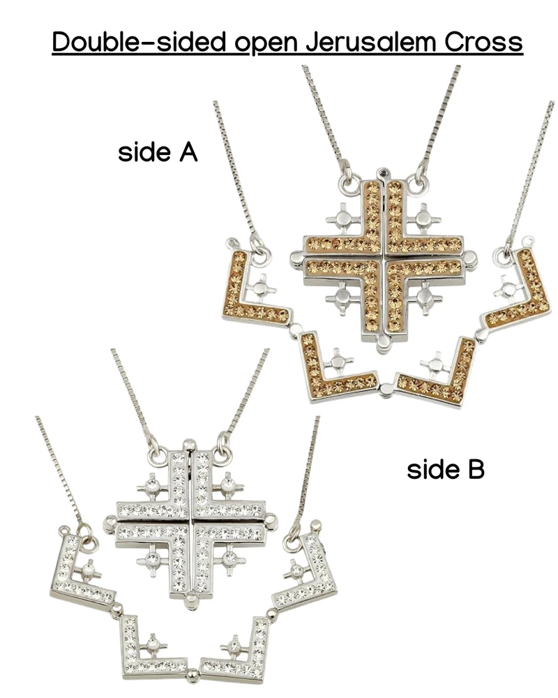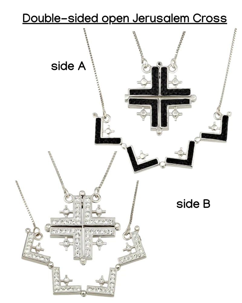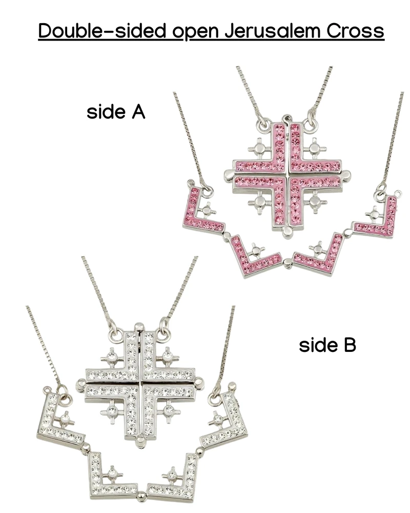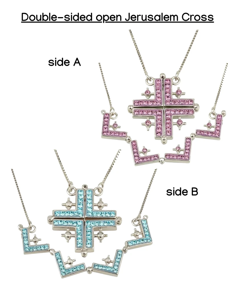 - Inspiring Jerusalem Cross - the belief of Jerusalem Cross is that the large cross represents Jesus Christ and the small four crosses represents Matthew, Mark, Luke, and John. The necklace has 4 different versions - open and clsoed with a magnet closure and then fliped on the other side showing different colors.